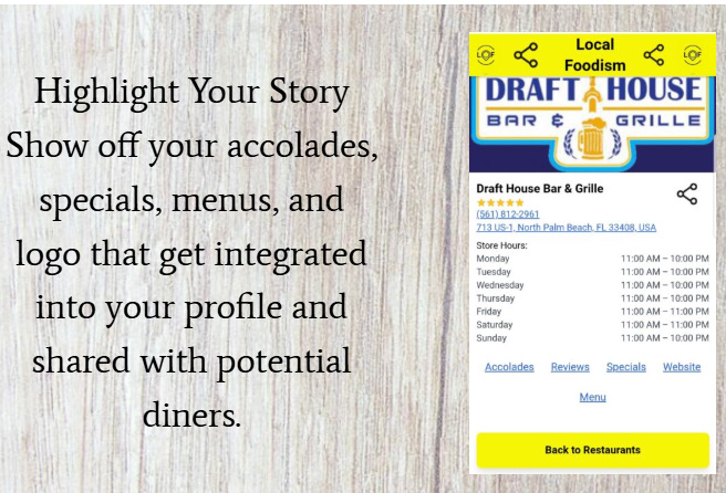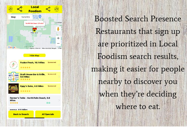 Local Foodism helps independent restaurants step into the spotlight and connect with nearby diners who are actively searching for great local food. When you sign up for our Restaurant Marketing program, you instantly unlock tools and promotional opportunities designed to increase your visibility, highlight what makes you unique, and drive more